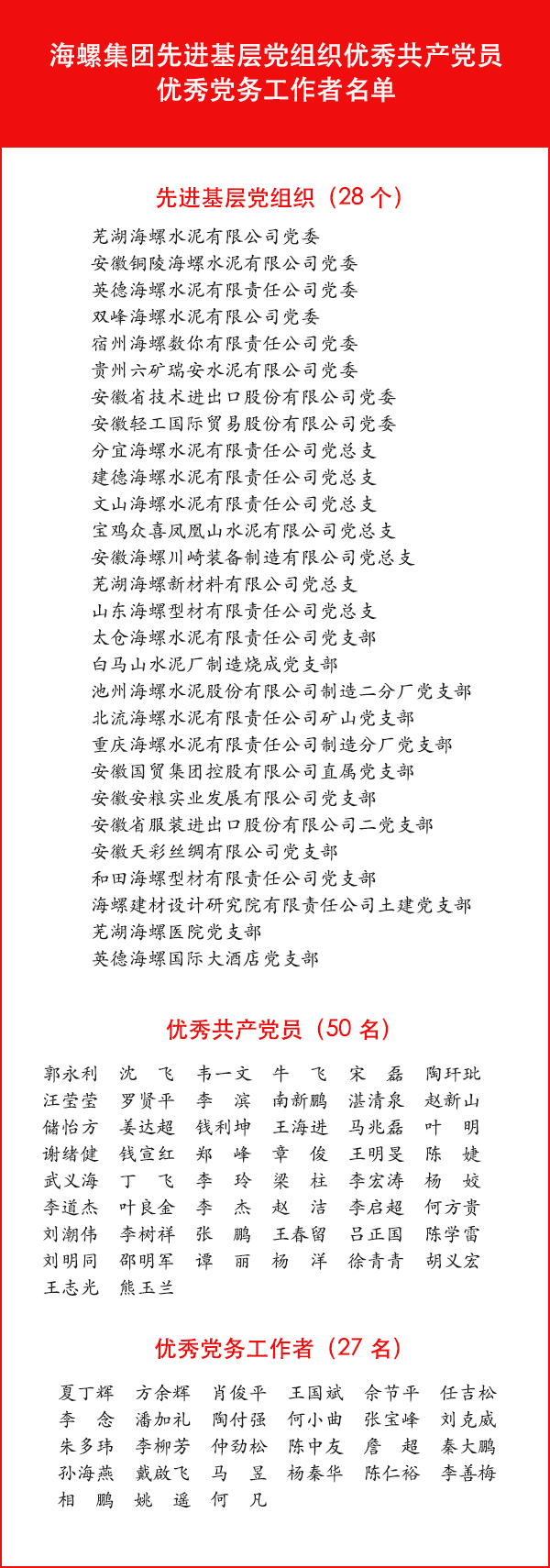 6月27日下午,集團(tuán)黨委在總部隆重召開慶祝建黨98周年暨“兩優(yōu)一先”表彰大會,慶祝中國共產(chǎn)黨98歲生日,集中表彰近兩年涌現(xiàn)出的先進(jìn)基層黨組織、優(yōu)秀共產(chǎn)黨員和優(yōu)秀黨務(wù)工作者,深入開展先進(jìn)典型教育,激勵各級黨組織和廣大黨員以先進(jìn)為榜樣,不忘入黨初心,堅定發(fā)展信心,擔(dān)負(fù)職責(zé)使命,為加快實現(xiàn)“一帶一路”和“一強(qiáng)三冠”發(fā)展目標(biāo)貢獻(xiàn)力量?! ?/p> 受表彰的先進(jìn)基層黨組織、優(yōu)秀共產(chǎn)黨員和優(yōu)秀黨務(wù)工作者代表,集團(tuán)黨政領(lǐng)導(dǎo)班子,集團(tuán)直屬黨委領(lǐng)導(dǎo)班子,省內(nèi)各企業(yè)黨委負(fù)責(zé)人以及機(jī)關(guān)部室負(fù)責(zé)人和黨員代表近200人現(xiàn)場參會。集團(tuán)各子公司黨組織班子成員和黨群部門負(fù)責(zé)人以視頻方式參會。會議由集團(tuán)黨委副書記、總經(jīng)理任勇同志主持。 會議在莊嚴(yán)的國歌聲中拉開序幕。 集團(tuán)公司黨委副書記齊生立同志宣讀了《關(guān)于表彰先進(jìn)基層黨組織優(yōu)秀共產(chǎn)黨員優(yōu)秀黨務(wù)工作者的決定》,授予蕪湖海螺黨委等28個黨組織“先進(jìn)基層黨組織”稱號;授予郭永利等50名同志“優(yōu)秀共產(chǎn)黨員”稱號;授予夏丁輝等27名同志“優(yōu)秀黨務(wù)工作者”稱號。 伴隨著激昂的音樂和熱烈的掌聲,集團(tuán)黨委領(lǐng)導(dǎo)向受表彰的先進(jìn)集體和先進(jìn)個人頒發(fā)了獎牌和證書。 蕪湖海螺汪哲伍、蕪湖海螺新材料公司戴啟飛、安徽輕工公司王明旻、池州海螺郭永利四名同志分別代表先進(jìn)基層黨組織、優(yōu)秀黨務(wù)工作者、優(yōu)秀共產(chǎn)黨員發(fā)言。他們表示要珍惜榮譽(yù)再出發(fā),堅定理想信念,牢記黨的宗旨,以更加飽滿的工作熱情和高昂的工作斗志,在集團(tuán)新一輪改革發(fā)展中建功立業(yè)。 集團(tuán)黨委書記、董事長高登榜同志為全體黨員上了一堂形勢與政策課,并對進(jìn)一步加強(qiáng)黨建工作提出要求?!?/p> 他首先代表集團(tuán)公司黨委,向受表彰的集體和個人表示熱烈的祝賀,向辛勤奮戰(zhàn)在公司各個崗位,尤其是生產(chǎn)一線和海外項目的廣大黨員致以節(jié)日的慰問。 他說,中國共產(chǎn)黨從嘉興南湖起航,開辟了一條中國特色航線。黨的十九大確立的習(xí)近平新時代中國特色社會主義思想,吹響了決勝全面建成小康社會、邁向社會主義現(xiàn)代化國家新征程的嘹亮號角,新時代中國特色社會主義航船再次揚(yáng)帆起航,踏上中華民族偉大復(fù)興的征程。 他表示,在省委和省國資委黨委的領(lǐng)導(dǎo)下,集團(tuán)黨委認(rèn)真貫徹落實習(xí)近平新時代中國特色社會主義思想和黨的十九大精神,圍繞“黨建出凝聚力、黨建強(qiáng)戰(zhàn)斗力、黨建促發(fā)展力、黨建贏競爭力”,推動黨建與企業(yè)中心工作深度融合,在政治建設(shè)、工作體系、廉政建設(shè)和黨建成效上都取得了明顯成績,為集團(tuán)公司經(jīng)營發(fā)展提供了堅強(qiáng)保證。 他指出,當(dāng)前國內(nèi)外形勢發(fā)生深刻復(fù)雜變化,風(fēng)險挑戰(zhàn)明顯增多,各級黨組織和廣大黨員要結(jié)合開展“不忘初心、牢記使命”主題教育,深入學(xué)習(xí)貫徹習(xí)近平新時代中國特色社會主義思想,深化對中央和省委各項決策部署的理解,準(zhǔn)確把握當(dāng)前集團(tuán)公司面臨的各種形勢,切實增強(qiáng)工作的緊迫感和責(zé)任感,凝心聚力,拼搏實干,為集團(tuán)公司又好又快發(fā)展作出新的更大貢獻(xiàn)。 他強(qiáng)調(diào),要提高站位,扎實開展主題教育,以主題教育為契機(jī),助力打造黨性修養(yǎng)有新提升、黨建工作有新提高、干部作風(fēng)有新形象、企業(yè)發(fā)展有新突破的“四新工程”;要認(rèn)真落實新時代黨的建設(shè)總要求,夯實基礎(chǔ),推進(jìn)基層黨組織全面進(jìn)步、全面過硬;要深入學(xué)習(xí)領(lǐng)會中央紀(jì)委、省紀(jì)委全會和省國資委有關(guān)會議精神,認(rèn)真落實黨風(fēng)廉政建設(shè)黨委主體責(zé)任和紀(jì)委監(jiān)督責(zé)任,持續(xù)鞏固“嚴(yán)強(qiáng)轉(zhuǎn)”專項行動成果,推動從嚴(yán)治黨向縱深發(fā)展;要加強(qiáng)群團(tuán)建設(shè),不斷提高新形勢下職工工作的針對性、有效性,切實為職工群眾做好事、辦實事、解難事,為企業(yè)改革發(fā)展凝聚強(qiáng)大合力;要落實責(zé)任,認(rèn)真抓好巡視問題,注重舉一反三,進(jìn)一步擴(kuò)大整改成果,做好巡視整改“后半篇文章”;要認(rèn)真總結(jié)上半年工作成效,對標(biāo)查找工作中存在的不足,理清下半年工作思路和舉措,扎實有效地做好生產(chǎn)經(jīng)營各項工作?! ?/p> 他號召,全體黨員要緊密團(tuán)結(jié)在以習(xí)近平同志為核心的黨中央周圍,深入貫徹落實好中央、省委各項決策部署,以飽滿的政治熱情,良好的工作作風(fēng),勇于擔(dān)當(dāng)?shù)木衩婷?,搶抓機(jī)遇、深化改革、加快發(fā)展,努力開創(chuàng)集團(tuán)黨建工作新局面,奮力實現(xiàn)集團(tuán)改革發(fā)展新突破,為把海螺建成具有全球競爭力的世界一流企業(yè)而努力奮斗。 任勇同志就貫徹此次會議精神提出要求,各單位要認(rèn)
