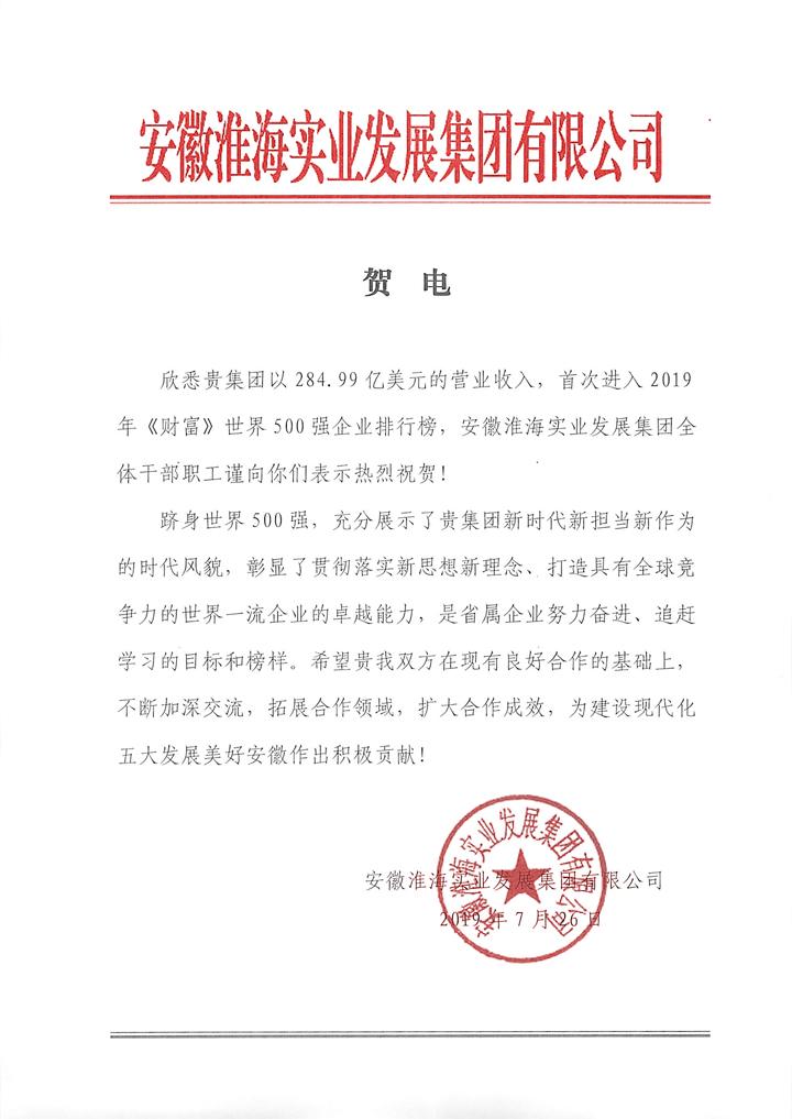 淮海實(shí)業(yè)發(fā)展集團(tuán)致海螺集團(tuán)賀信